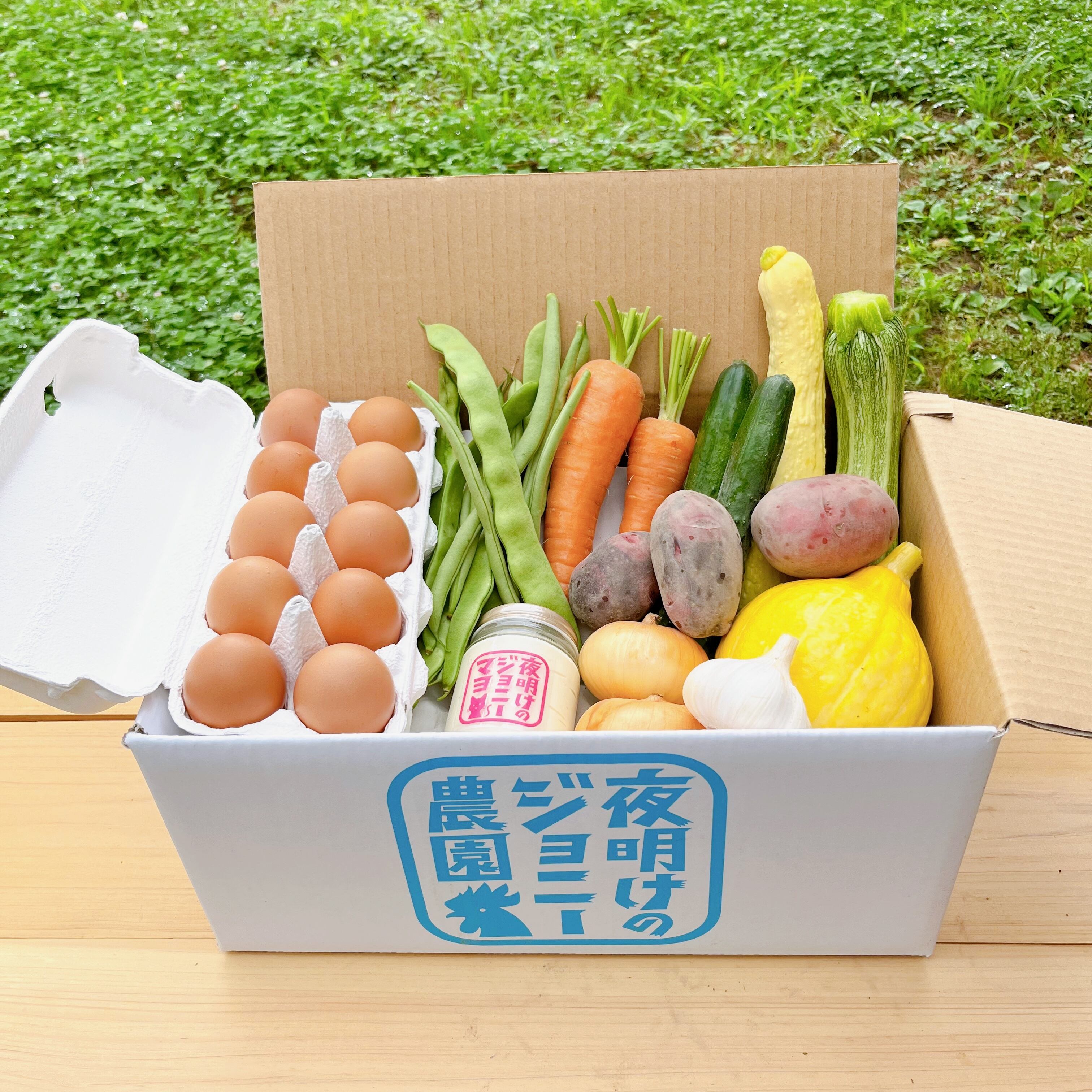 内容:卵10個入り1パック、夜明けのジョニーマヨ、ジョニーの黒うどん、旬のお野菜8種類前後(おまかせ)
